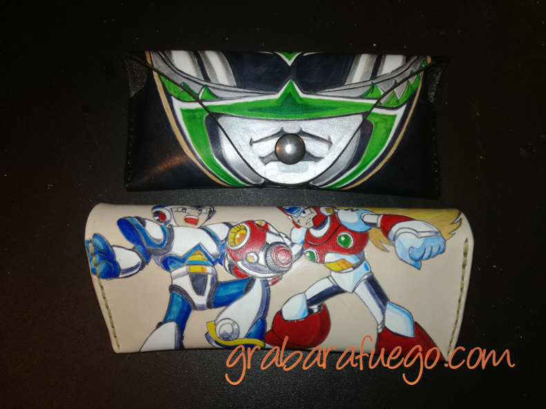 Como otras fundas de gafas que he hecho anteriormente, están realizadas en vaquetilla de 1.5 mm de grosor, pirograbadas a mano y teñidas a pincel. Además, como tienen ambas bastantes partes blancas, pues llevan pintura, que es un material que no suelo utilizar, porque me gusta más cómo queda el tinte, pero que en este caso es la nota que le hacía falta para que el diseño se ajustara al original lo más posible.